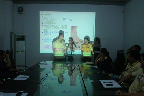 陳老師還現(xiàn)場(chǎng)向員工們傳授了穴位保健相關(guān)基礎(chǔ)知識(shí)和有效的預(yù)防及改善方法。通過(guò)真人模擬的方式,用電療儀等輔助治療器械幫助員工了解疏通穴位、測(cè)量血壓的操作方法。